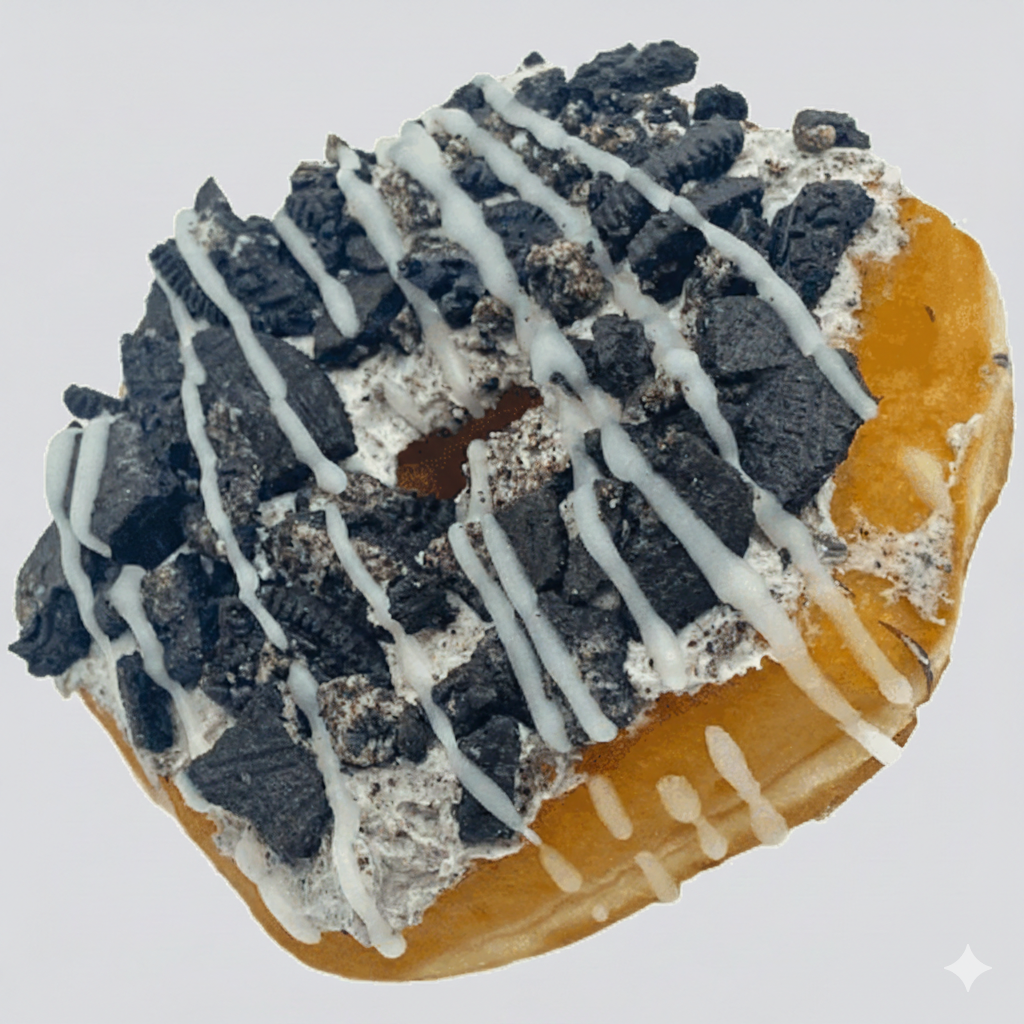 Yeast risen deep fried donut topped with cookies n’ cream butter cream, crushed oreo, white chocolate glaze drizzles