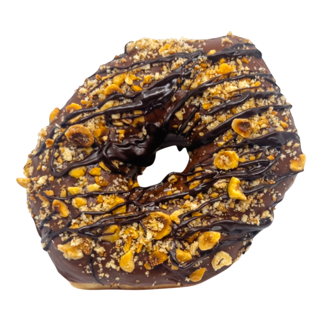 Yeast risen deep fried ring donut dipped in a hazelnut cocoa glaze topped with chopped assorted nuts and chocolate ganache drizzles