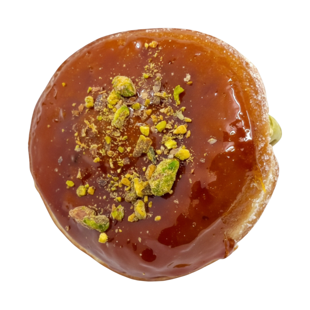 Yeast risen deep fried donut rolled on sugar filled with pistachio whipped custard cream topped with caramelized sugar and chopped pistachio