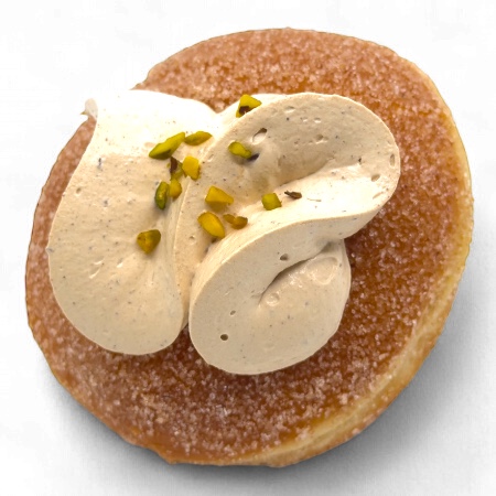 Yeast risen deep fried donut rolled on cinnamon sugar and filled with pumpkin spiced pastry cream and topped with caramel whipped cream and chopped pistachio