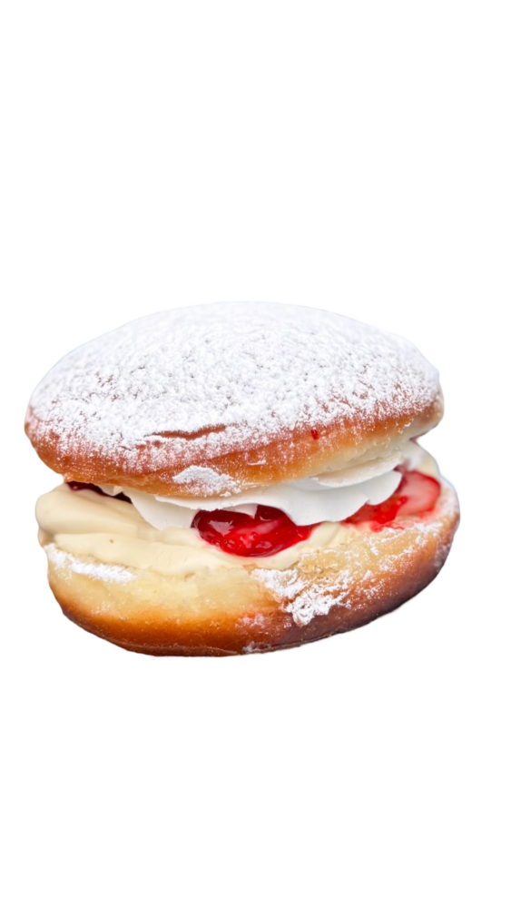 Yeast risen deep fried donut cut into half filled with whipped custard, strawberry jam with fresh cut banana and whipped cream. Dusted powdered sugar on top.
